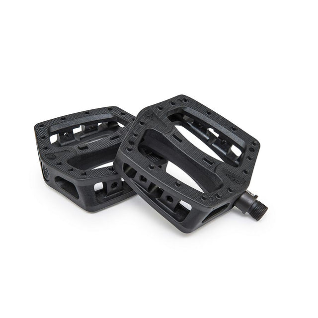 Pedales Eclat Plaza - Plataforma de composite/plástico de 9/16" en negro. Los Plaza cuentan con una plataforma excepcionalmente grande con pasadores hexagonales de perfil cóncavo y moleteado extrafino. Nailon/fibra de vidrio moldeados por inyección